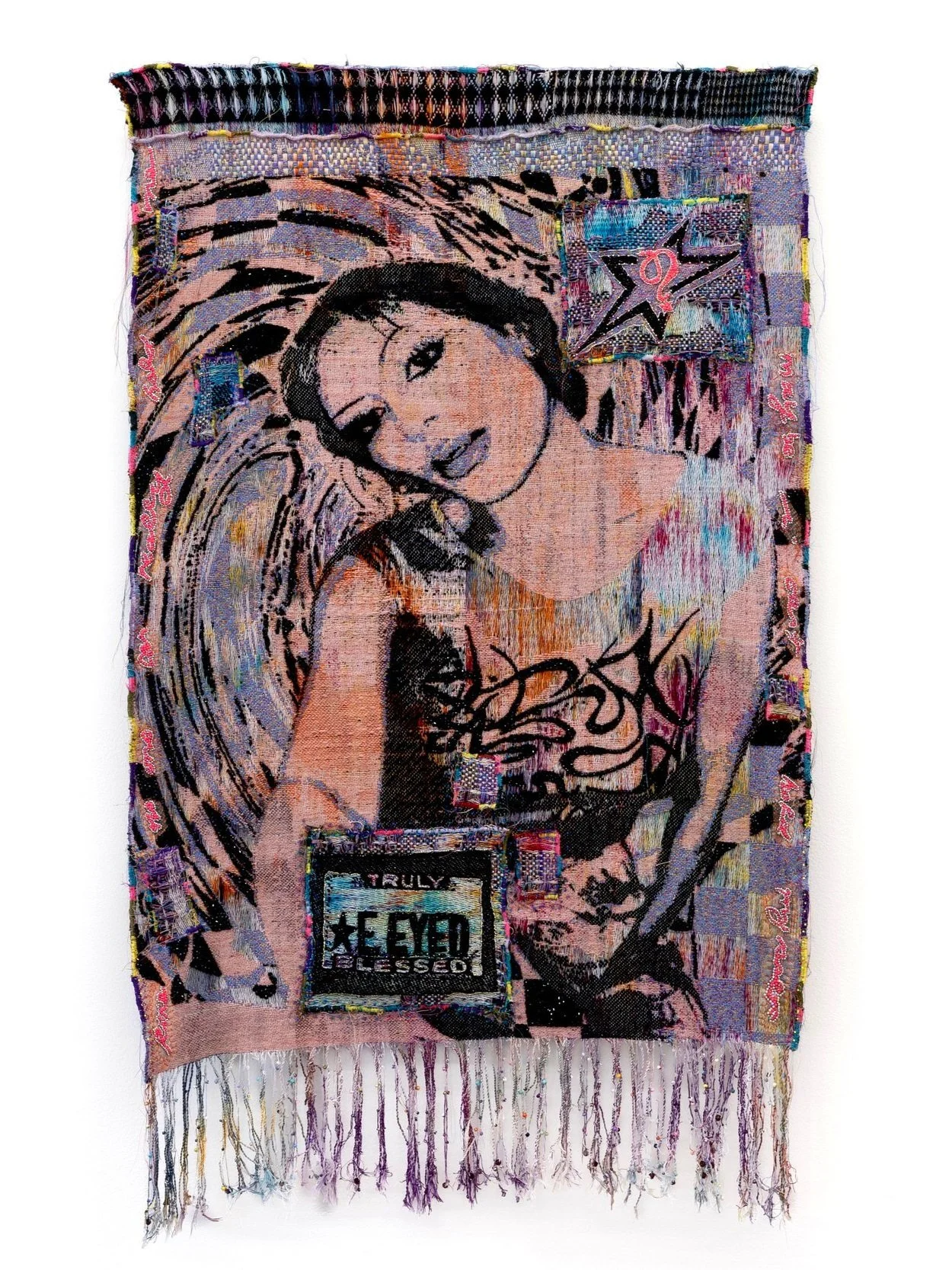 “⭐️E-EYED” 2024. 48 x 26 in. handwoven fabrics on tc2, wool, beads and rhinestones.