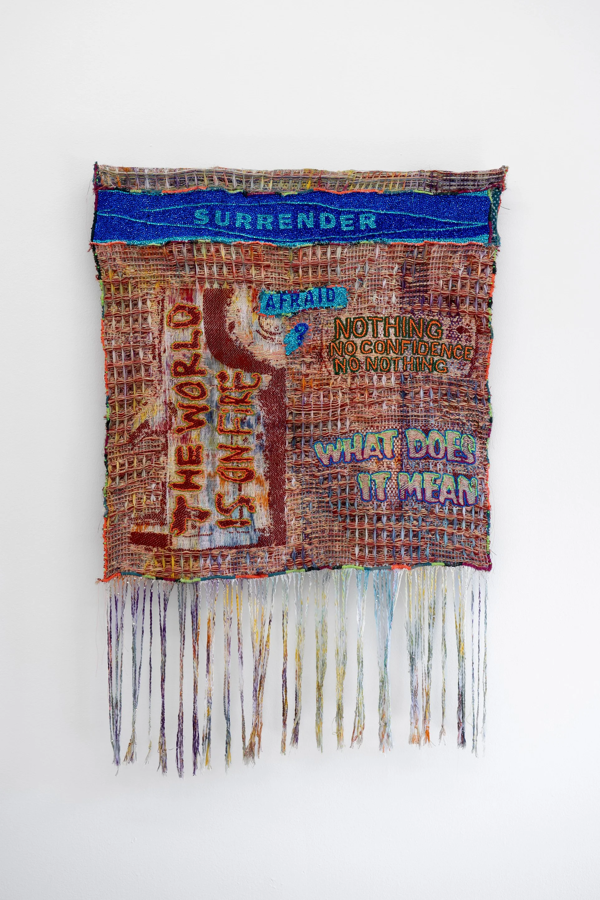 “Afraid ?” 2024. 41 x 27 in. handwoven on tc2, cotton, wool, thread and rhinestones.